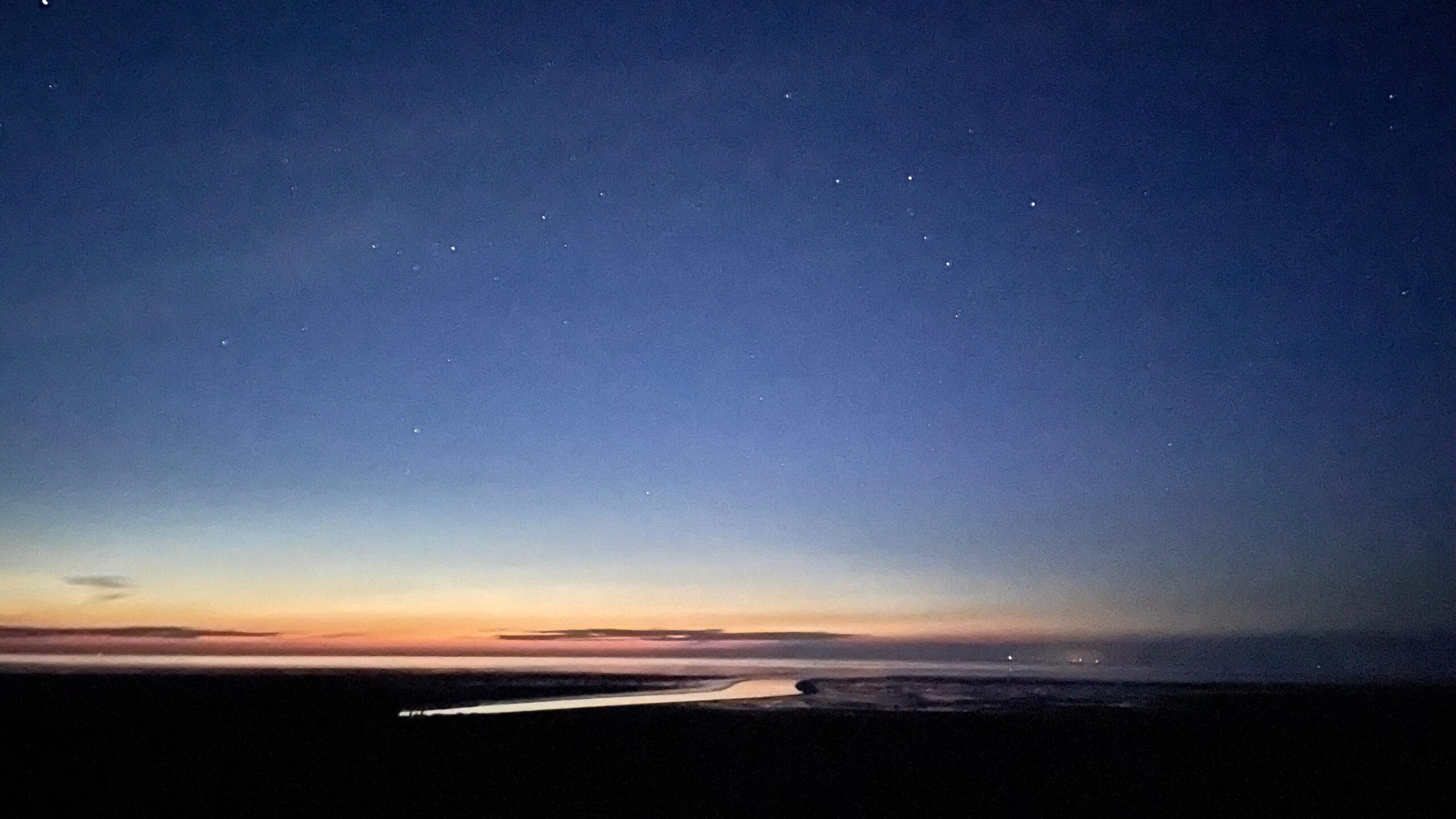 Van de lichte nevel die boven de sloten op het vaste land hing hadden we bij zee geen last. Hoe donkerder het werd, hoe meer duidelijk werd dat het een fantastisch heldere avond zou worden. Steeds zwakkere sterretjes prikten door de transparante, azuurblauwe hemel heen. Aan de horizon zwaaiden vertrouwd de vuurtorens van de Waddeneilanden.